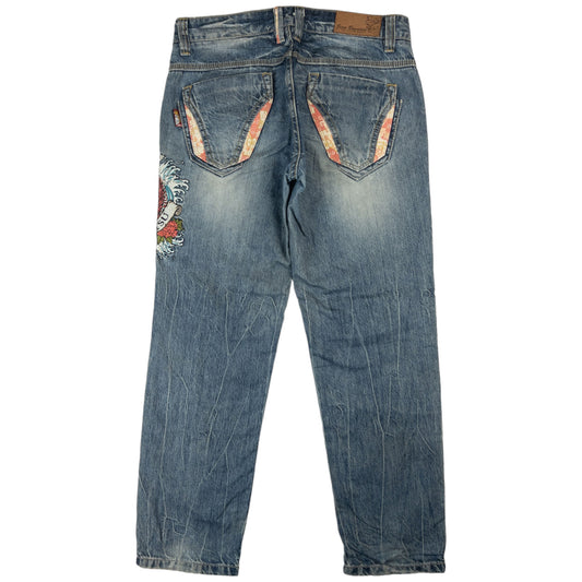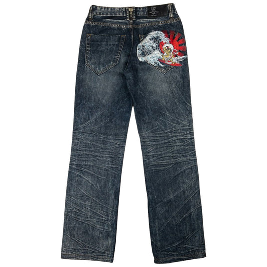Vintage Jizo Bosatsu Embroidered Koi Fish Troll Japanese Denim Jeans Size W31