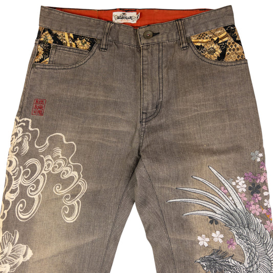 Vintage Kara Kuri Tamashii Embroidered Patchwork Japanese Denim Jeans Size W31