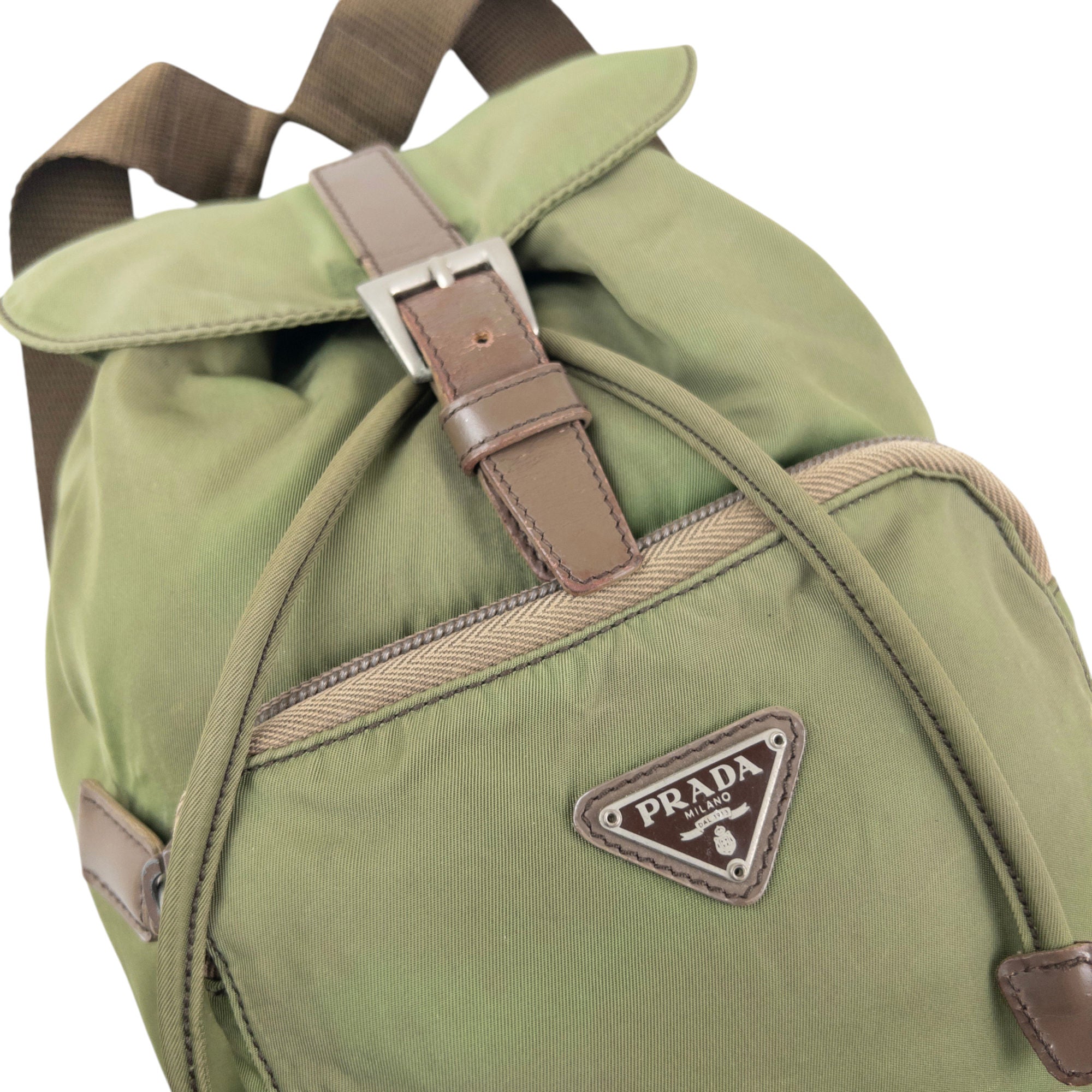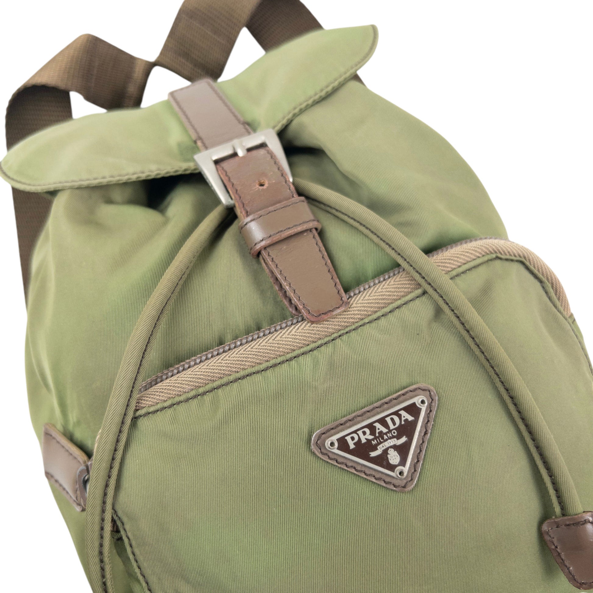 Other info: Green colour, brown accent colour, prada symbole plate detail, drawstring closure, minor general wear as seen