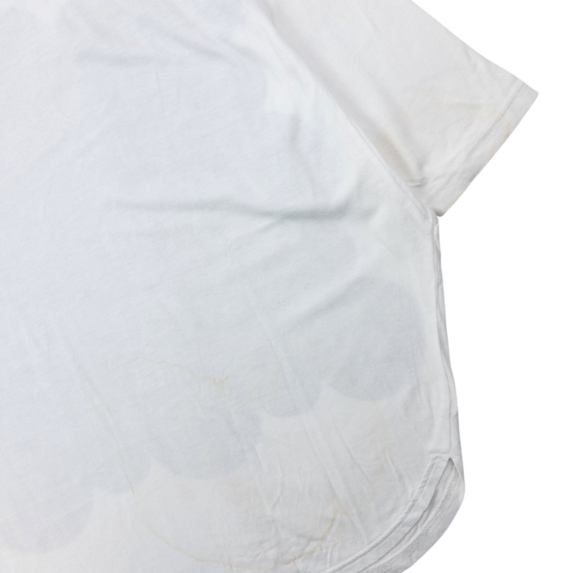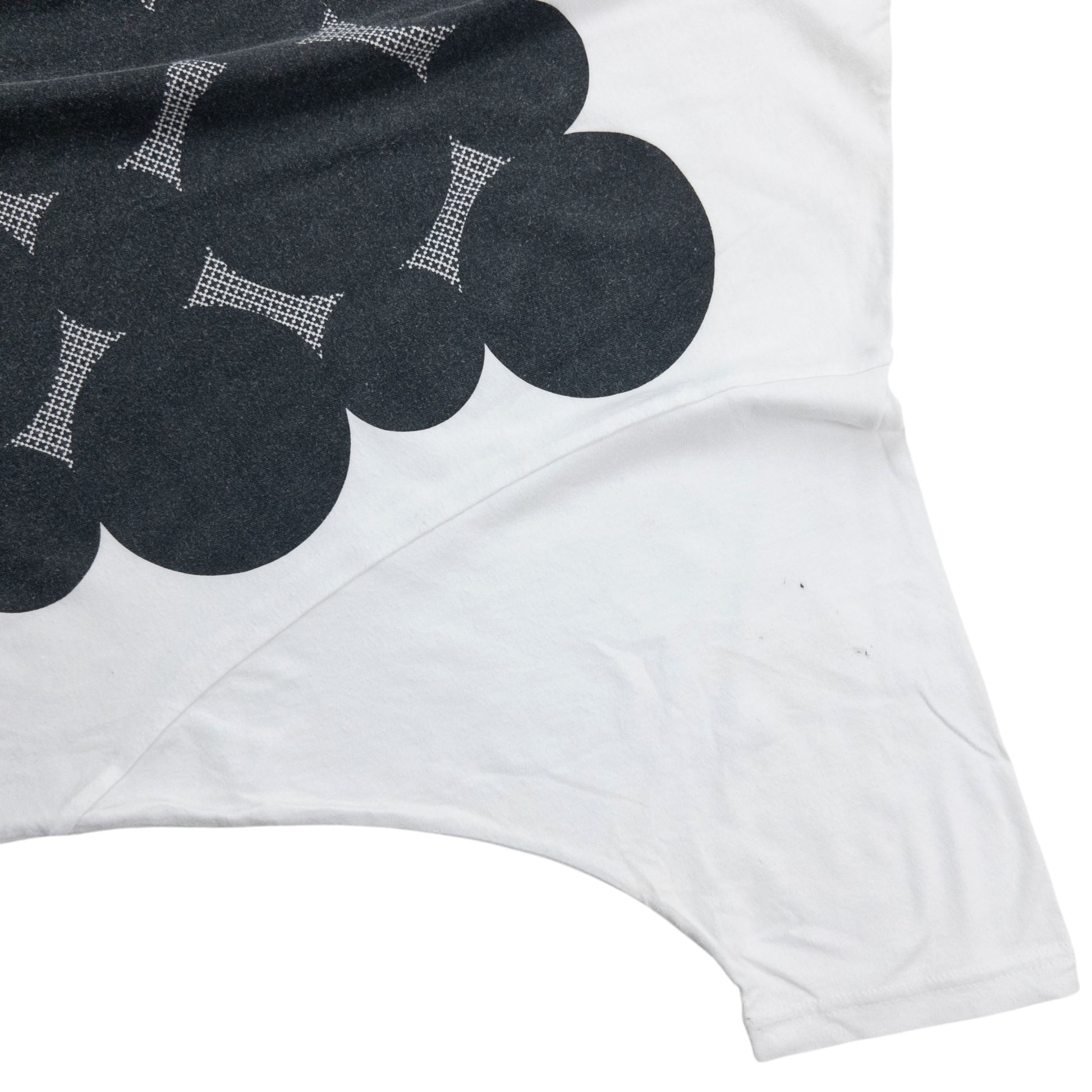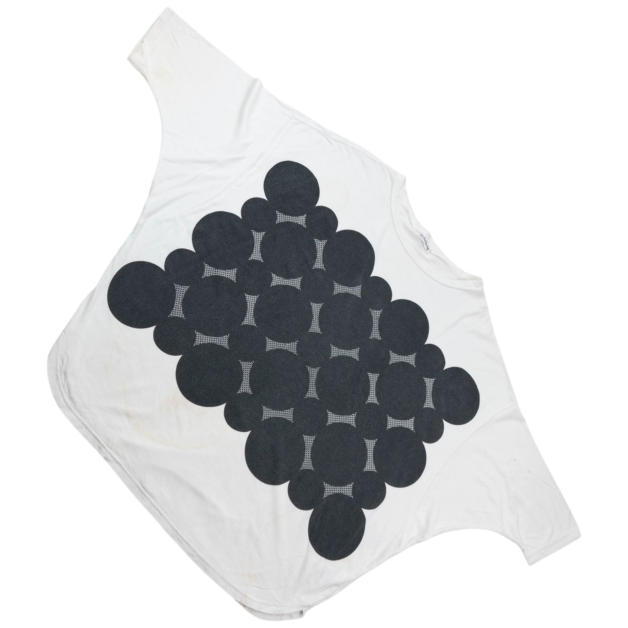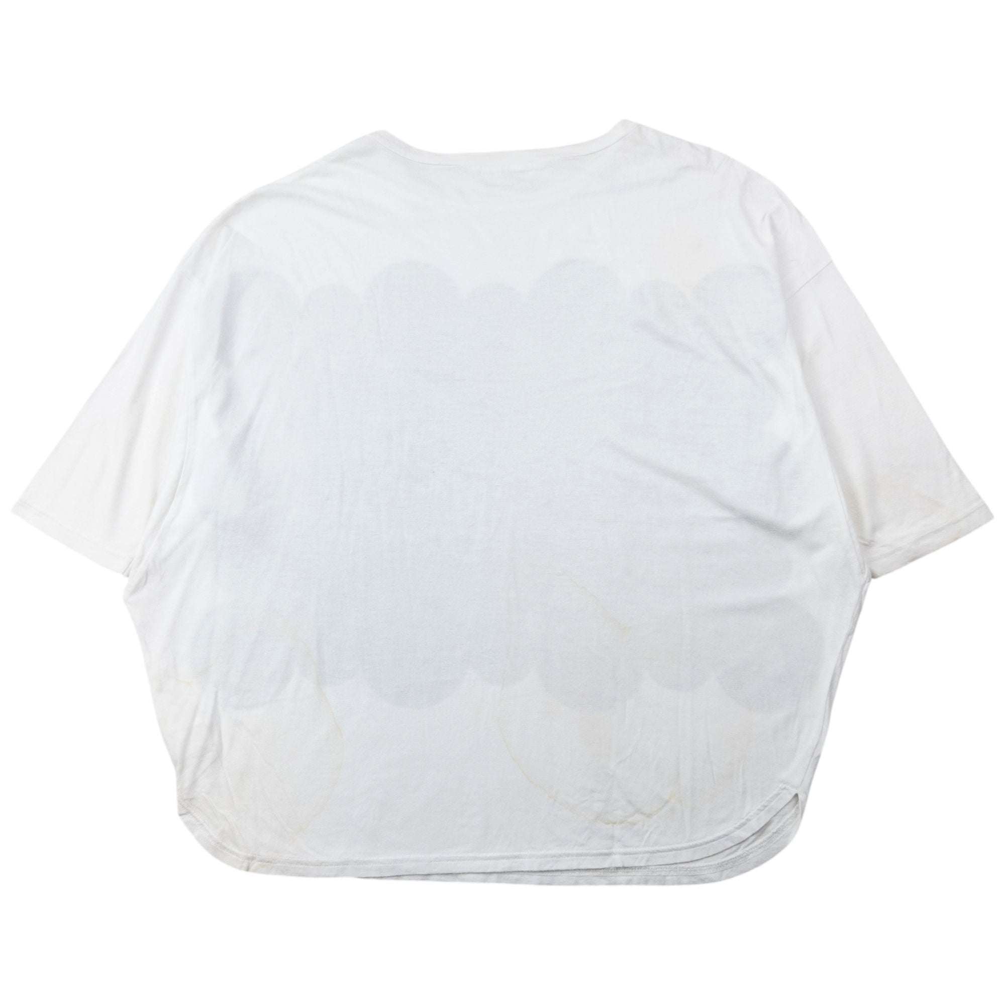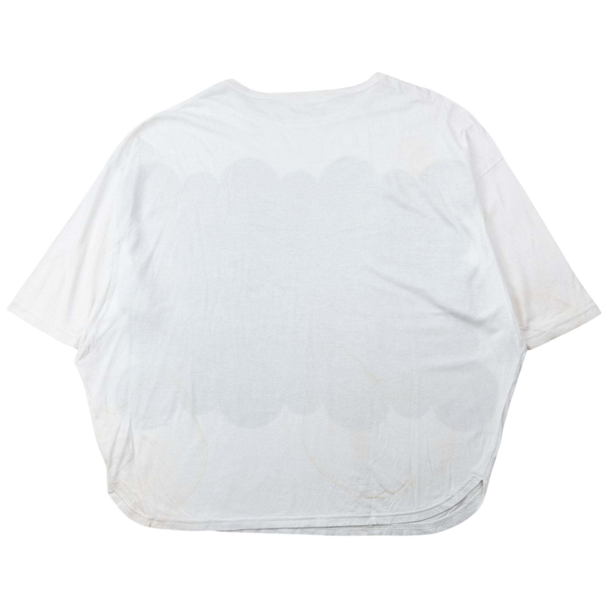 Other info: White colour, black circle pattern graphic, wide-rounded fit, some marks as shown
